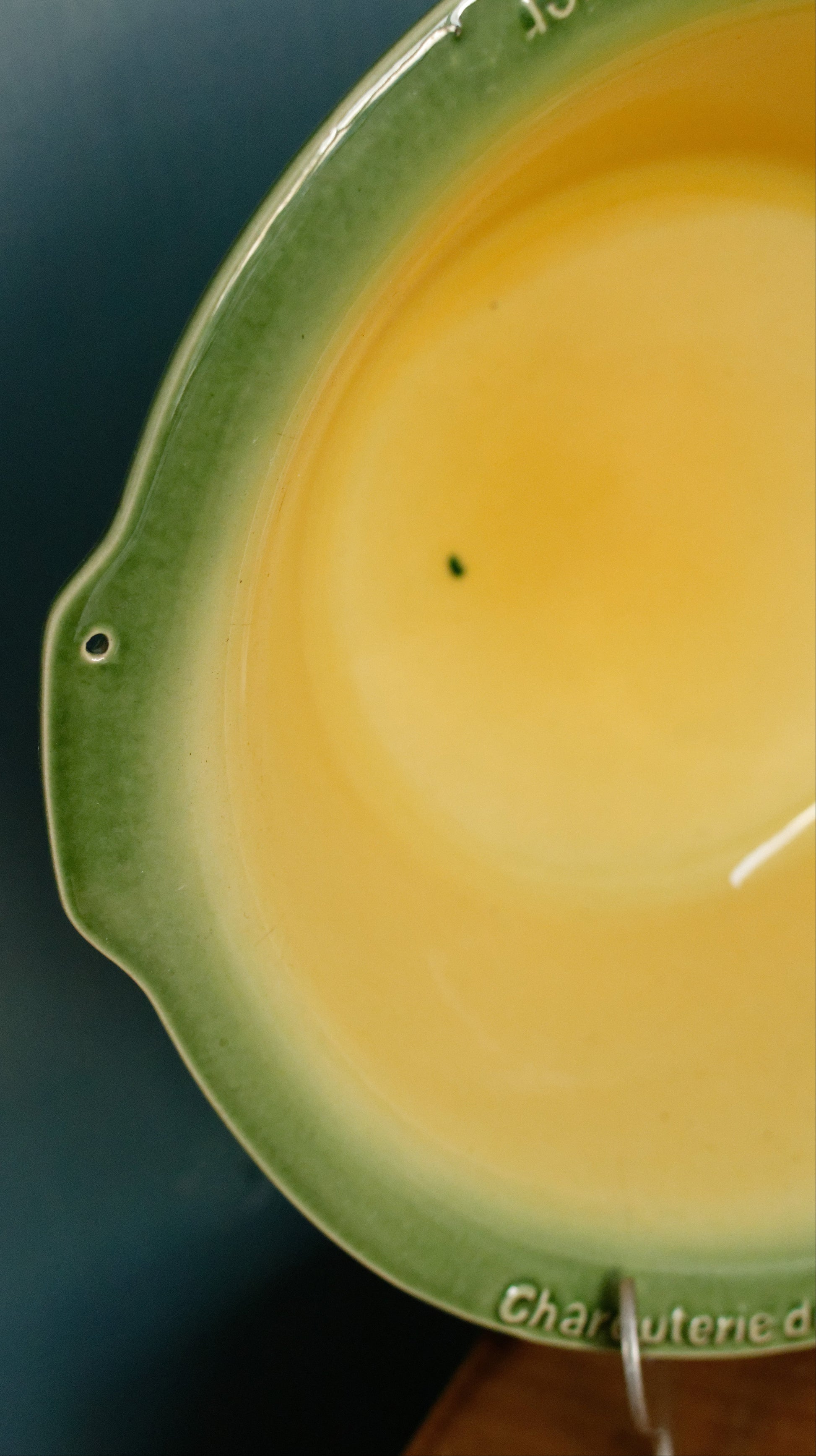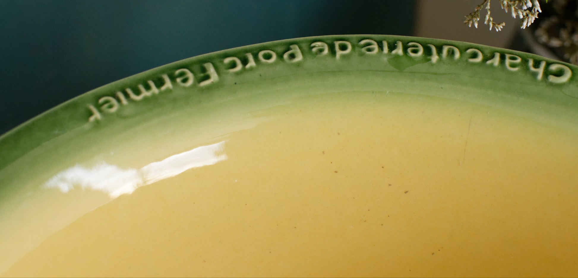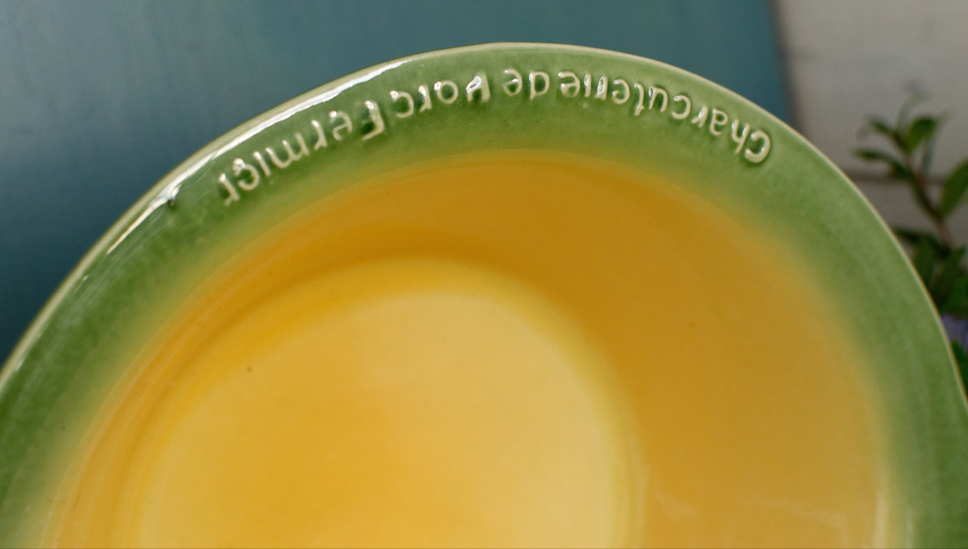 Il s'agit d'une charcuterie bicolore verte avec un intérieur jaune, portant l'inscription « Charcuterie de Porc Fermier » sur les deux faces. Le dessous est estampillé du numéro 8516, probablement le numéro du moule utilisé pour sa fabrication.