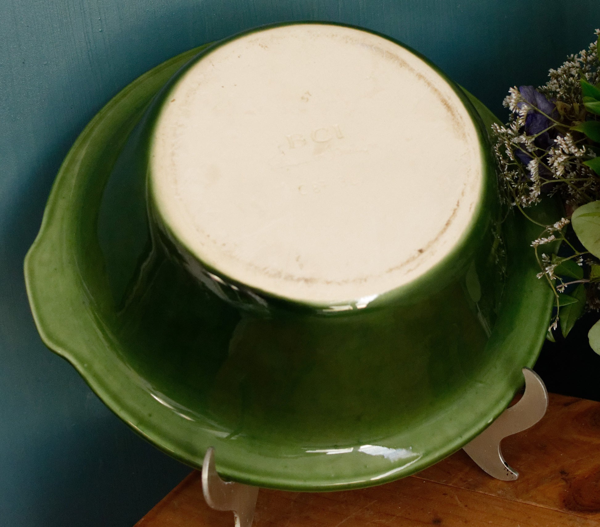En bon état rustique compte tenu de son âge. On observe des marques d'usage, des marques du temps sur le vernis et des imperfections de fabrication dues à l'émaillage, ainsi qu'un joli craquelé dû à la cuisson. La patine verte présente un contraste qui ajoute à son charme. Le fond et l'intérieur du pot portent des traces de cuisson et présentent des rayures superficielles. Deux zones du décor présentent de petits éclats, probablement dus à l'usage ou à un défaut de fabrication lors de la cuisson. Tous ces défauts décoratifs sont visibles sur les photos ; veuillez utiliser la fonction zoom pour les observer plus en détail.