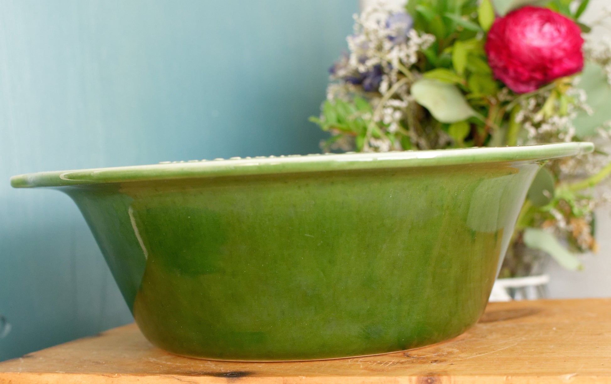 Charmant plat à four rustique vintage en grès émaillé, de forme ovale. Ce type de terrine, destiné à la cuisson au four, était traditionnellement utilisé pour la cuisson lente de viandes ou d'aliments nécessitant une cuisson fondante, comme les gratins, ou encore pour des préparations nécessitant une longue cuisson, comme le foie gras. Sa conception permet une répartition homogène de la chaleur sur le fond et les côtés, évitant ainsi une cuisson inégale et le risque de brûler les aliments.