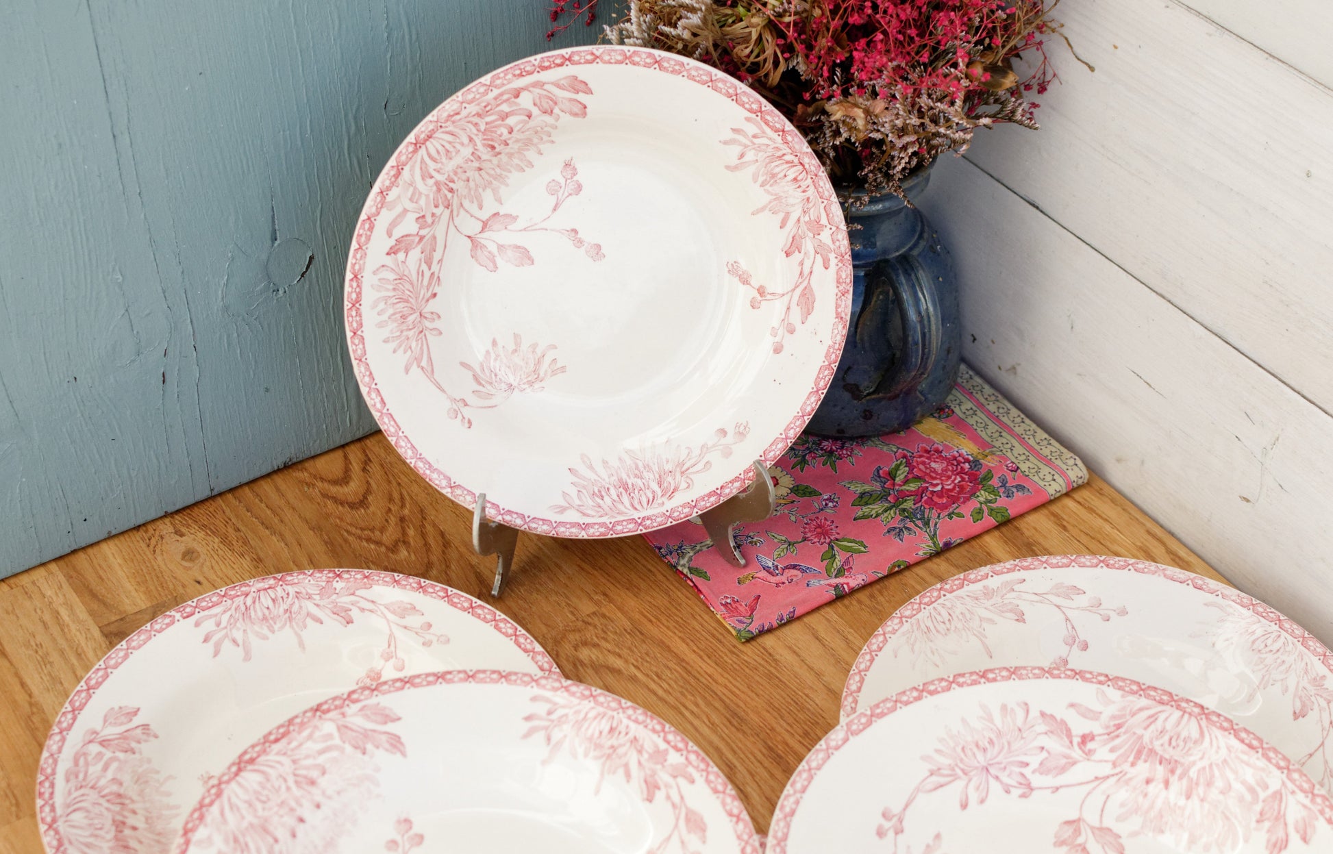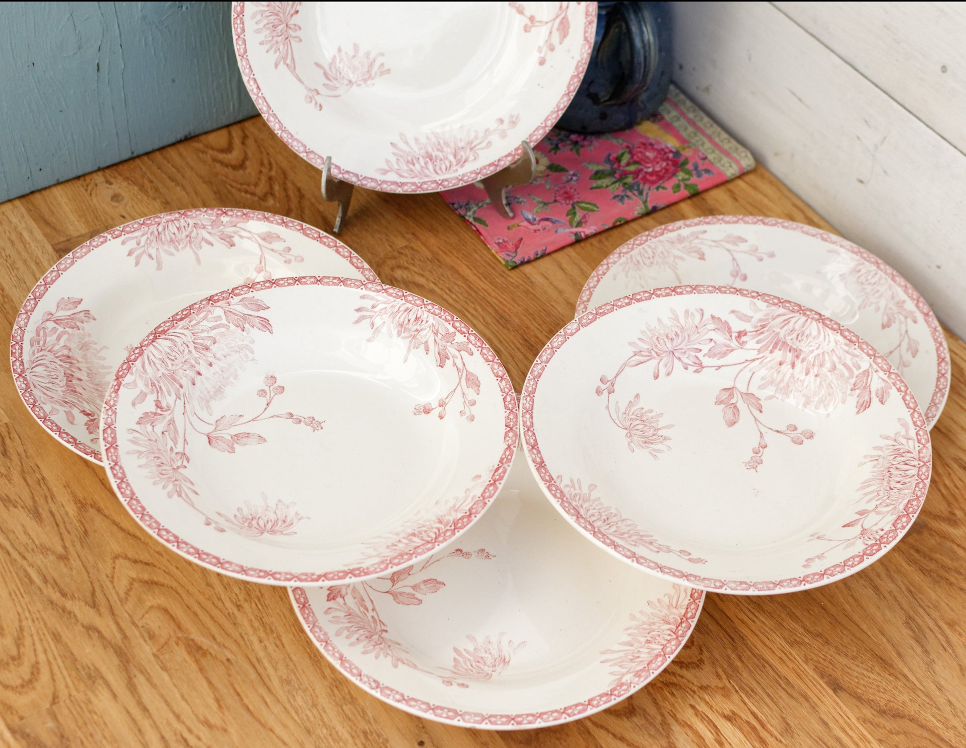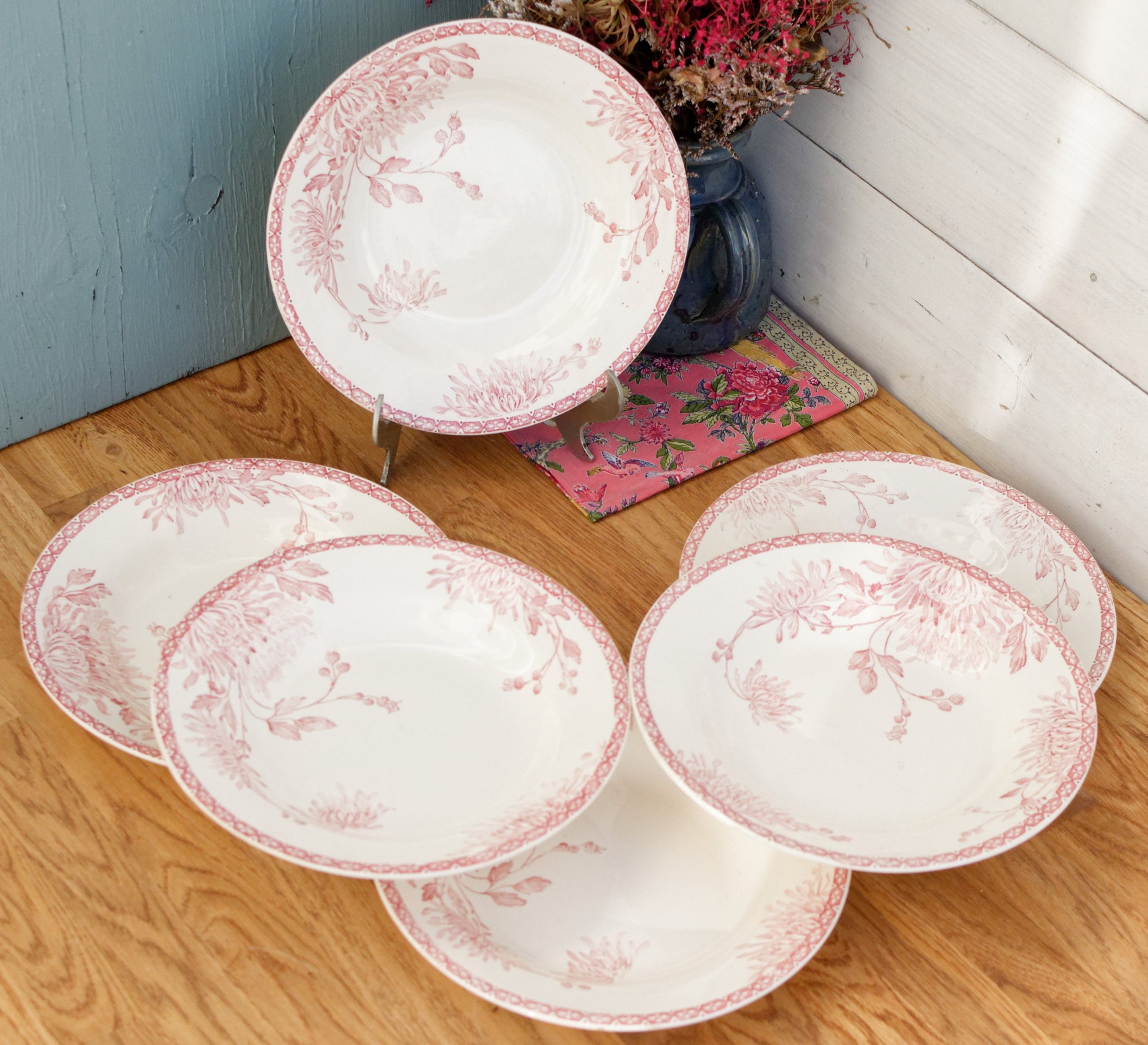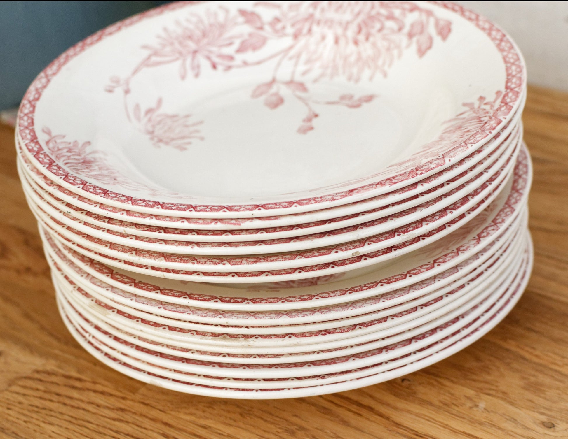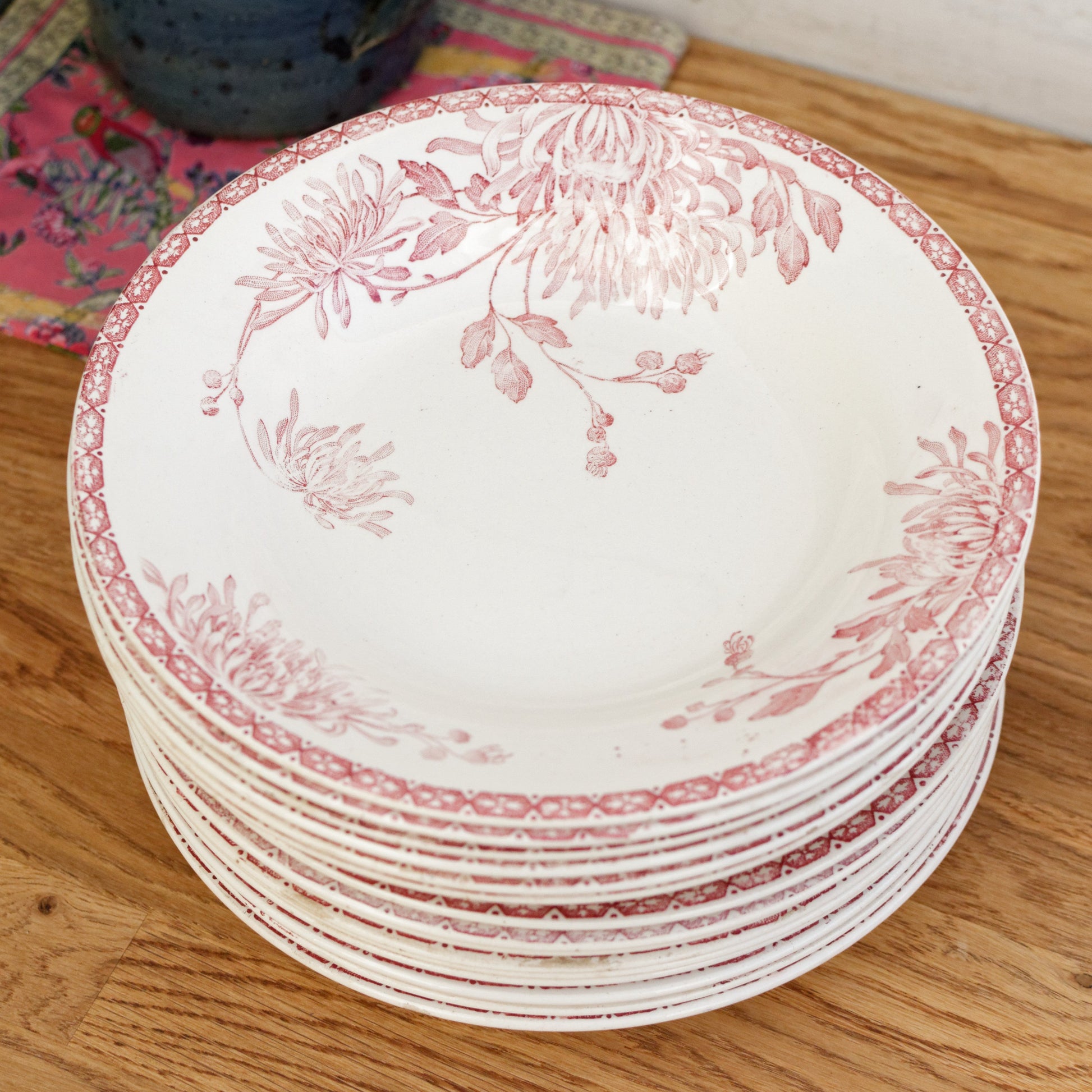 フランス ヴィンテージ アンティーク アイアンストーン レッド トランスファーウェア フラットエッジ ホロウ スーププレート フランス語で「Assiette Creuse」。このユニークなサービスは、Labrabor Motif では「Service Turenne」と呼ばれています。フランスのテール・ド・フェールにある有名な陶器ファイアンスリーメーカー「Creil et Montereau」によって作られています。クレイユ モントロー陶器の生産は、セーヌ エ マルヌ県のモントローとオワーズ県のクレイユのコミューンで行われ、1797 年に設立されました。