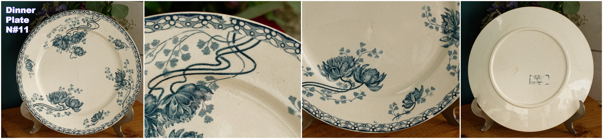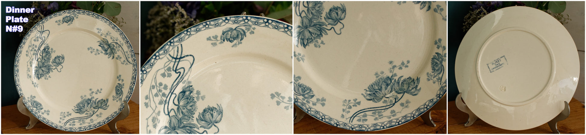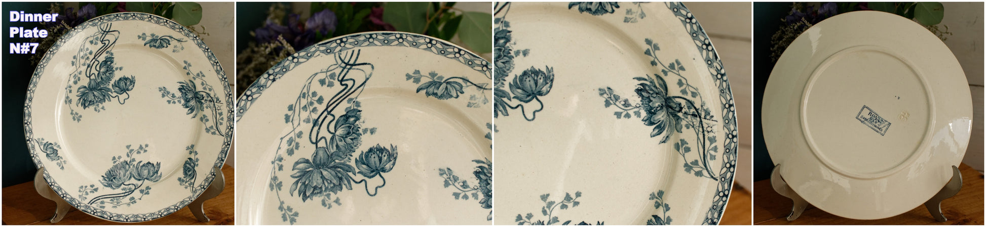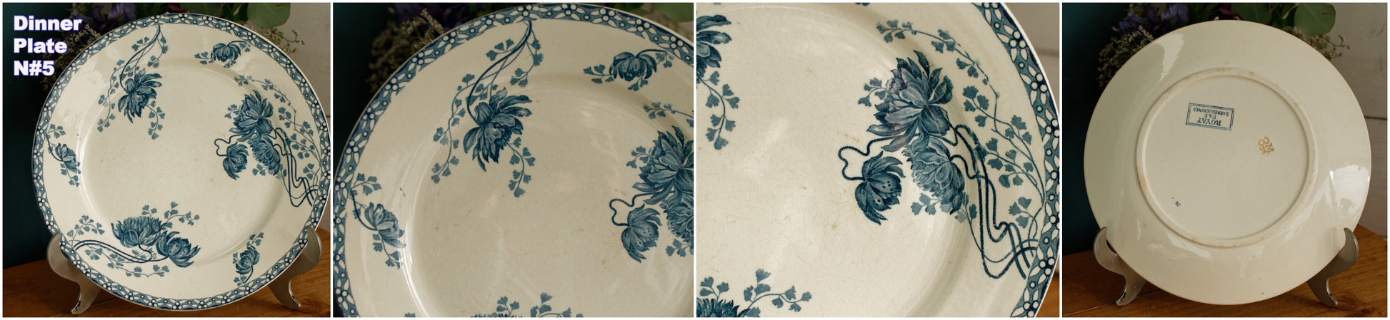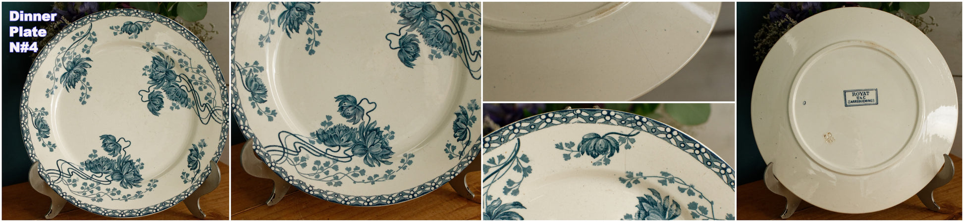 素朴なヴィンテージコンディション。古いものを考慮すると、表面の特定の箇所にパターンのにじみ/インク跡/色あせ、わずかから目に見える変色のさまざまな領域(写真のコラージュ、特にプレートn#3を確認してください)、製造上のマークと表面の斑点/釉薬の傷、いくつかの器具があります。マーク/表面の傷、表面に製造/釉薬の跡、保護釉薬が摩耗したエッジの周囲の領域、またはワニスのない小さな跡(表面が滑らかではない、または保護釉薬の小さな欠け)があり、写真(コラージュ)に示されているように、装飾的な表面にひび割れがあります。ご不明な点がございましたらお問い合わせください。 ZOOMを使用してプレートの詳細と状態を詳しく確認してください。