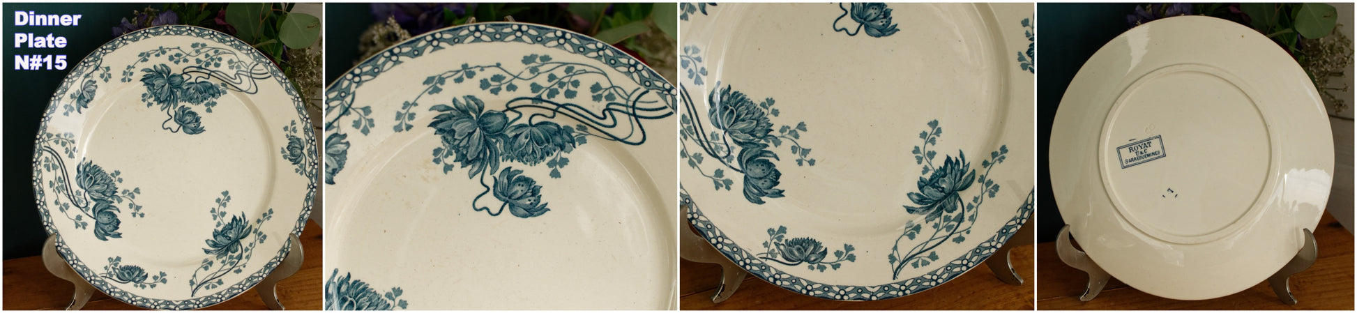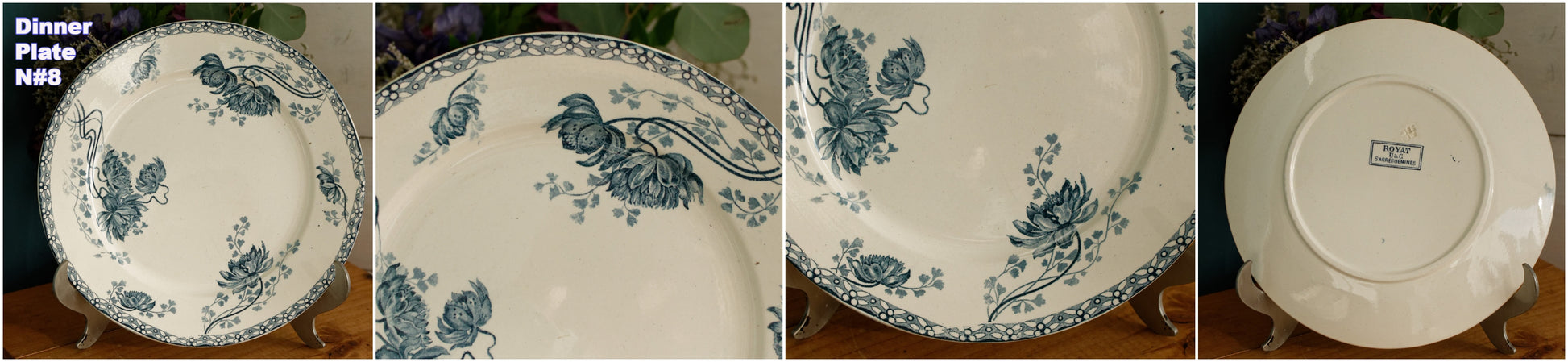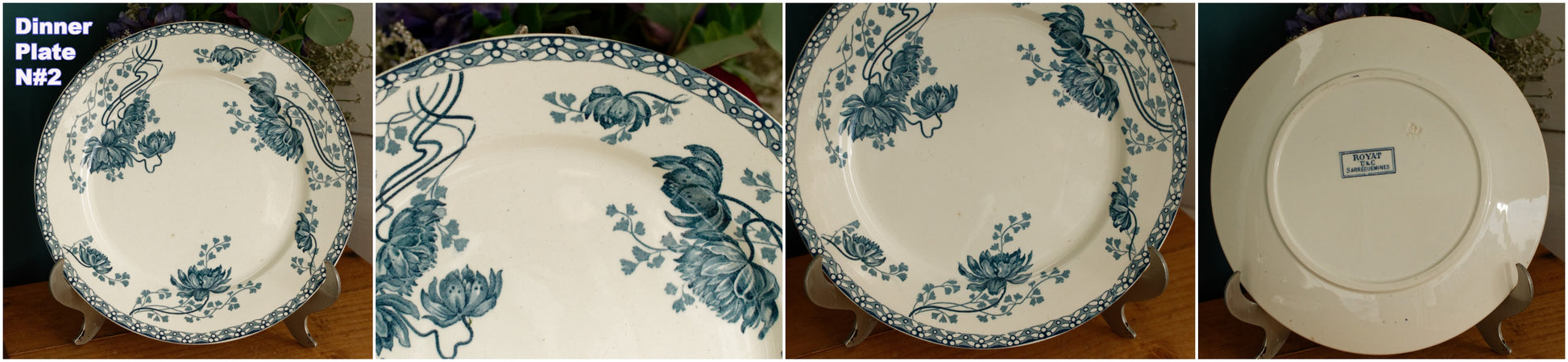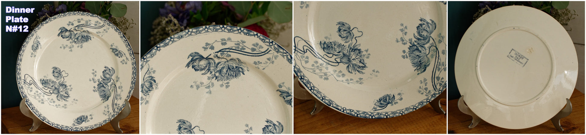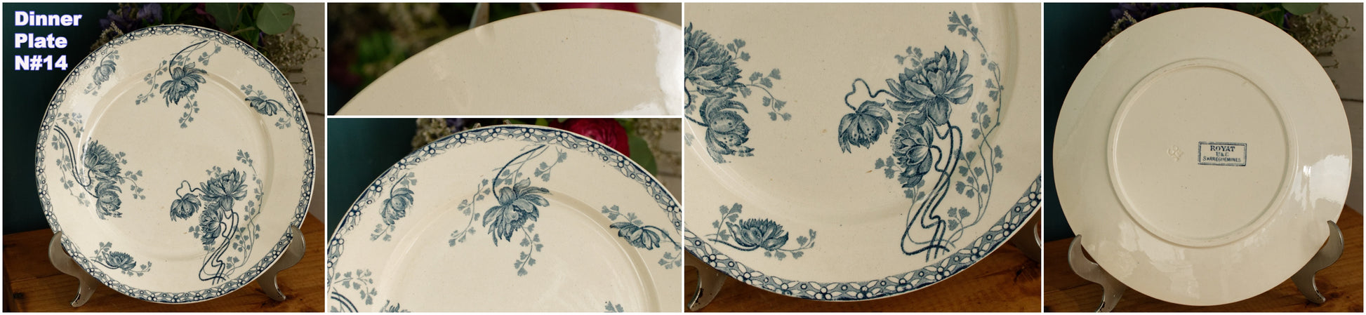 素敵なフランスアンティークアイアンストーンブルートランスファーウェアヴィンテージDインナープレートフランス語で「Assiette」。シリーズ名は「ROYAT」。フランスのテール・ド・フェールにある陶器ファイアンスの有名メーカー「Sarreguemines U&Cie」製。このマークは 1900 年代初頭 (1900 年から 1909 年の間) に遡ります。刻印: « ROYAT - U&C - Sarraguemines» フランス。