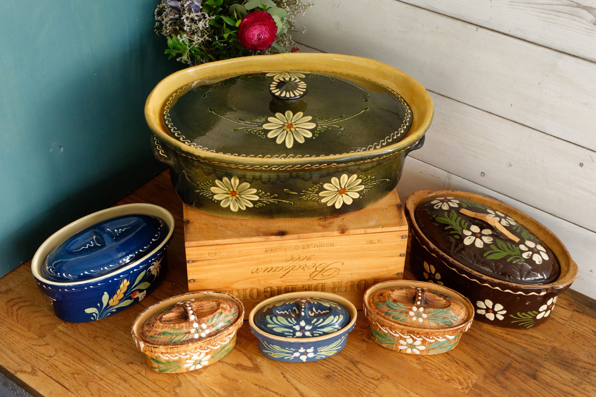 素敵なフランス ヴィンテージ アンティーク オーバル フォアグラ テリーヌ カバー付き - ラ ブルゴーニュ - フランス製。この釉薬をかけた石器テラコッタ パテ テリーヌ (チュリーン)/蓋付き素朴なキャセロール ポット チュリーンは、提供する数に応じてさまざまなサイズの鍋でアヒルまたはガチョウの肝臓をオーブンで調理するためのものです。フランスで選ばれるパテは、ガチョウの肝臓から作られた有名な「フォアグラ」です。上部のつまみには蒸気を逃がすための小さな穴が開いています。他の肉の保存や調理にも使用できます。ストーンウェアで調理すると、料理に柔らかさと風味が加わります。 。セラミックパテキャセロールポット。