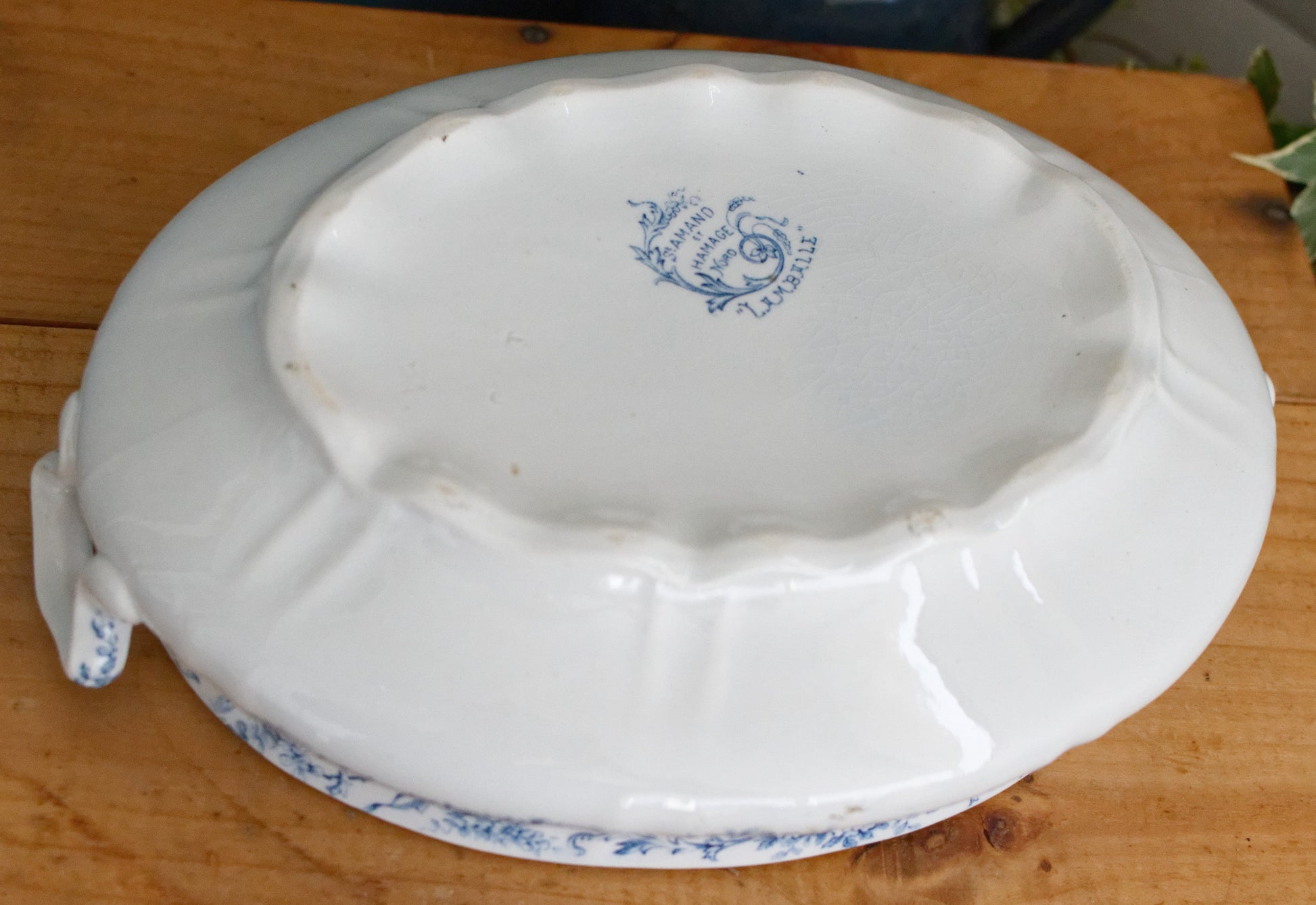 Lovely French Vintage Antique Ironstone Blue Transferware ("Faience" in French) Covered Serving Piece, Soup Tureen, Vegetable Dish and "Soupiere" or "Légumière" in French. Made by famous French manufacturer of Earthware Faience France, in Terre de Fer, circa . Stamped « LAMBALLE St Amand et Hamage Nord ».