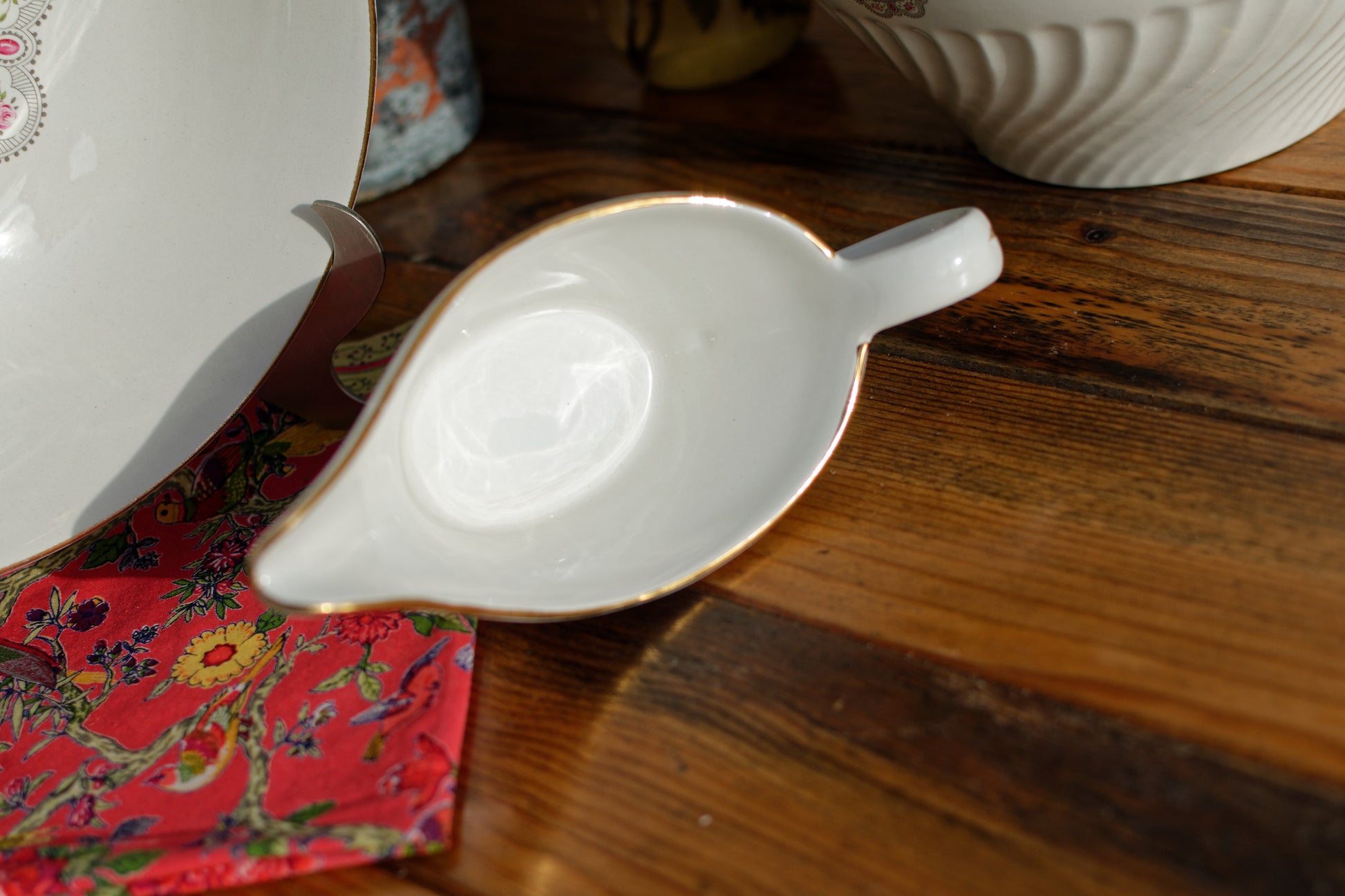 Lovely French Antique Ironstone Floral Vintage Gravy Boat "Saucier" in French. Made by famous French manufacturer of Earthware Faience "KG (Keller et Guérin) Lunéville" France, in Terre de Fer, circa 1930s. The white ceramic is decorated with a swirled edge and a gold trim, with a lovely centerpiece of floral decoration in pink, gold, green and yellow. Stamped or marked: « Lunéville, K G, Tradition, Depuis 1731, France »