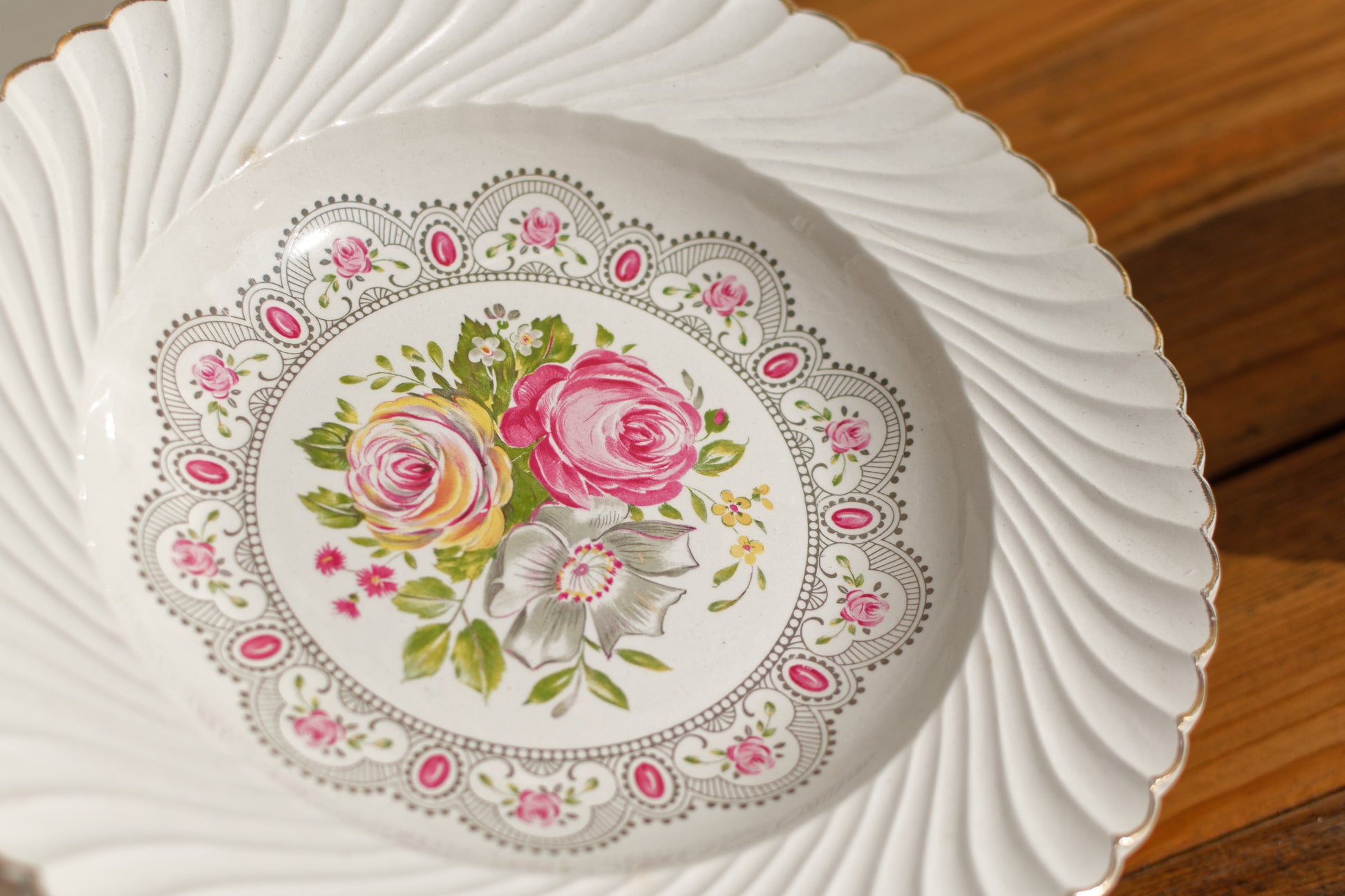 They are in lovely vintage condition due to the age however there are some signs of usage and lovely imperfections such as minor pattern bleeding/fading in certain spots as seen in the gold trim, manufacturing marks/surface bumps from the old glazing process, minor surface marks from utensils, tiny marks on the edges where there is no varnish/glaze as shown in the photo collages. PLEASE use ZOOM to review closely the detail and condition of the plates.