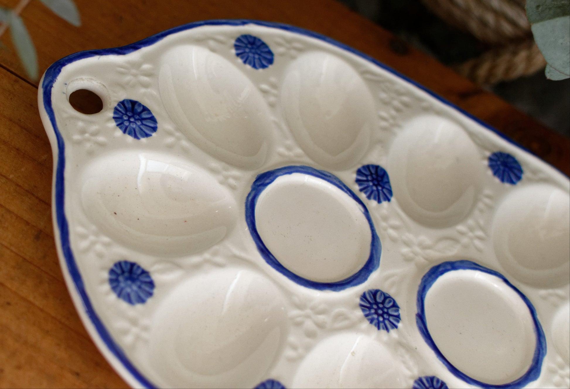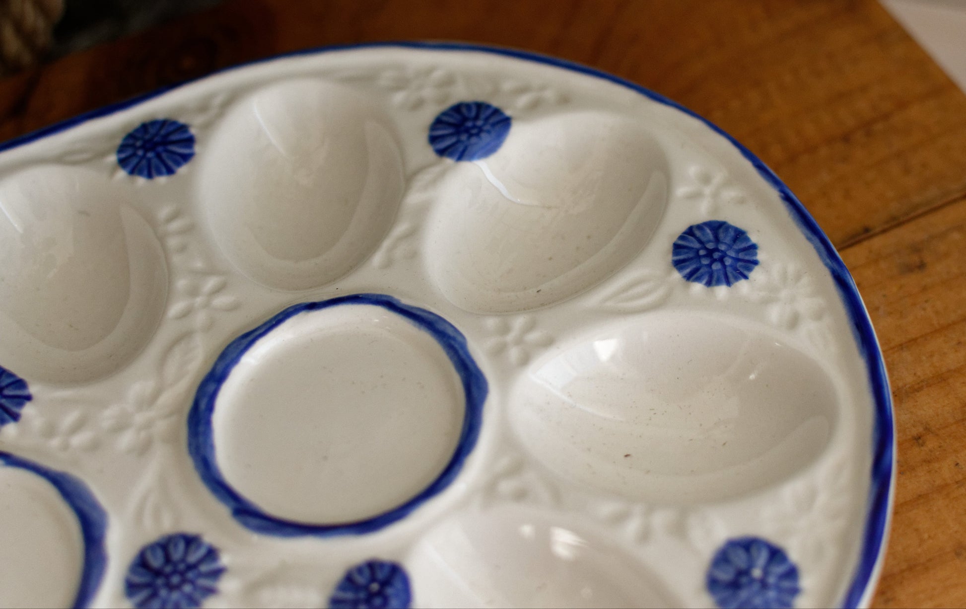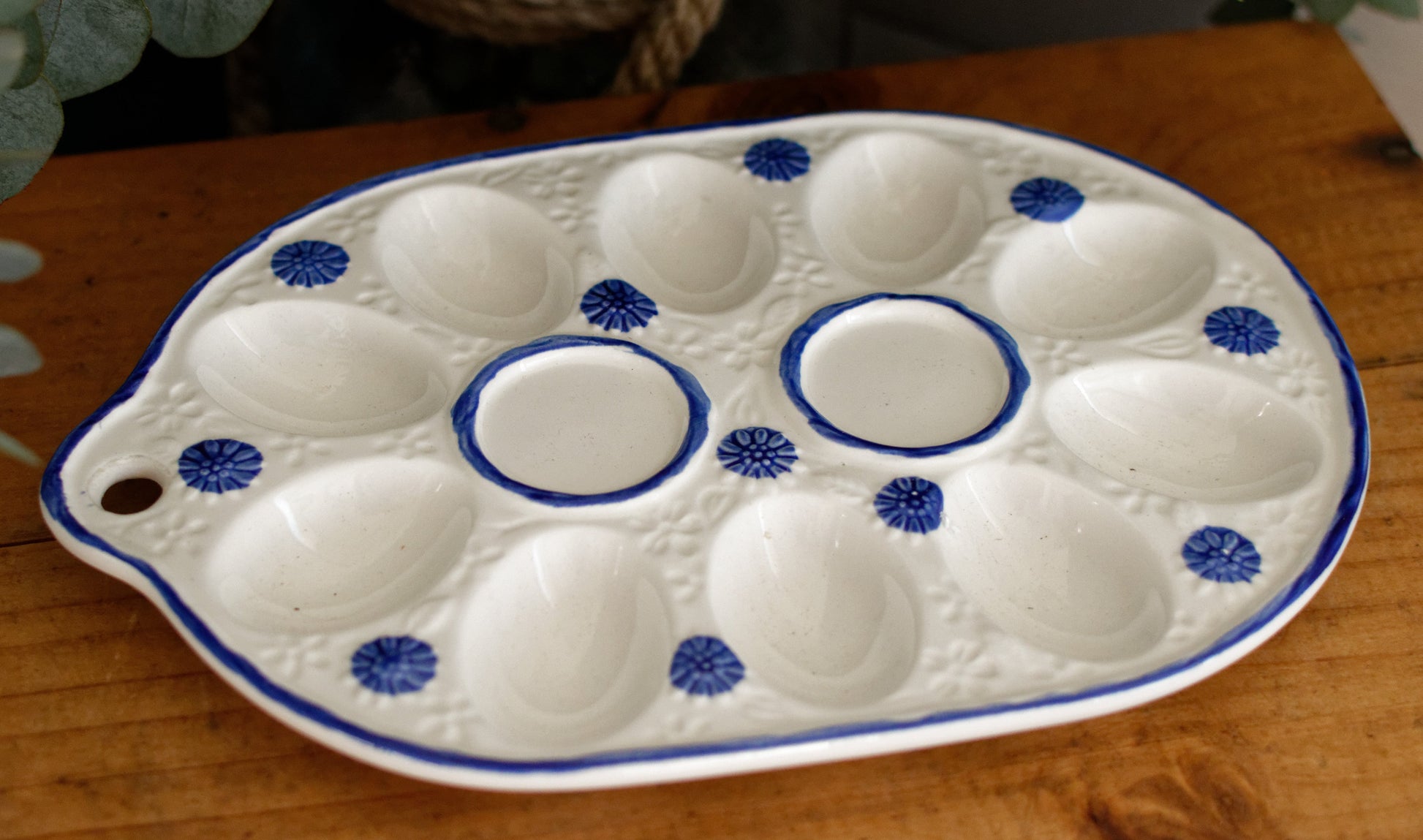 Vintage Ceramic Deviled Eggs Presentation Platter Plate & Chicken Shaped Salt & Pepper Shakers ~ Plateau de presentation Oeufs Dur Mimosa Saliere et Poivriere" ~ White & Blue Serving Set