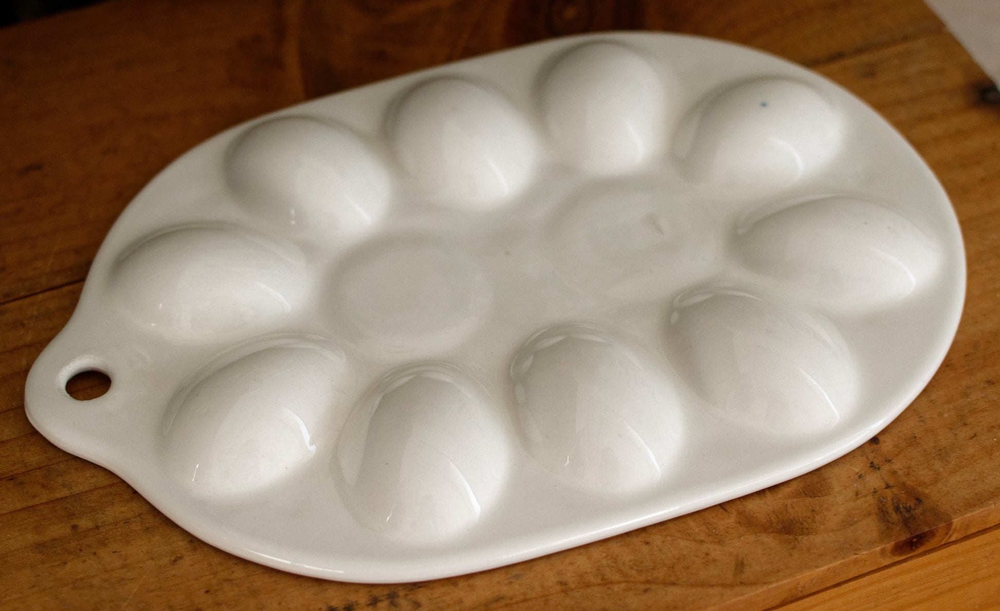 Vintage Decorative Ceramic Presentation Platter for Deviled Eggs with matching Salt & Pepper Shakers in the shape of a chicken (Coq Rooster) in lovely white & blue color. "Ancien Plateau de presentation oeufs dur Mimosa a la coque saliere et poivriere poules faience" in French. The plate has 10 egg shape hollow areas to present deviled eggs with 2 round spacs in the center to hold the salt & pepper shaker.