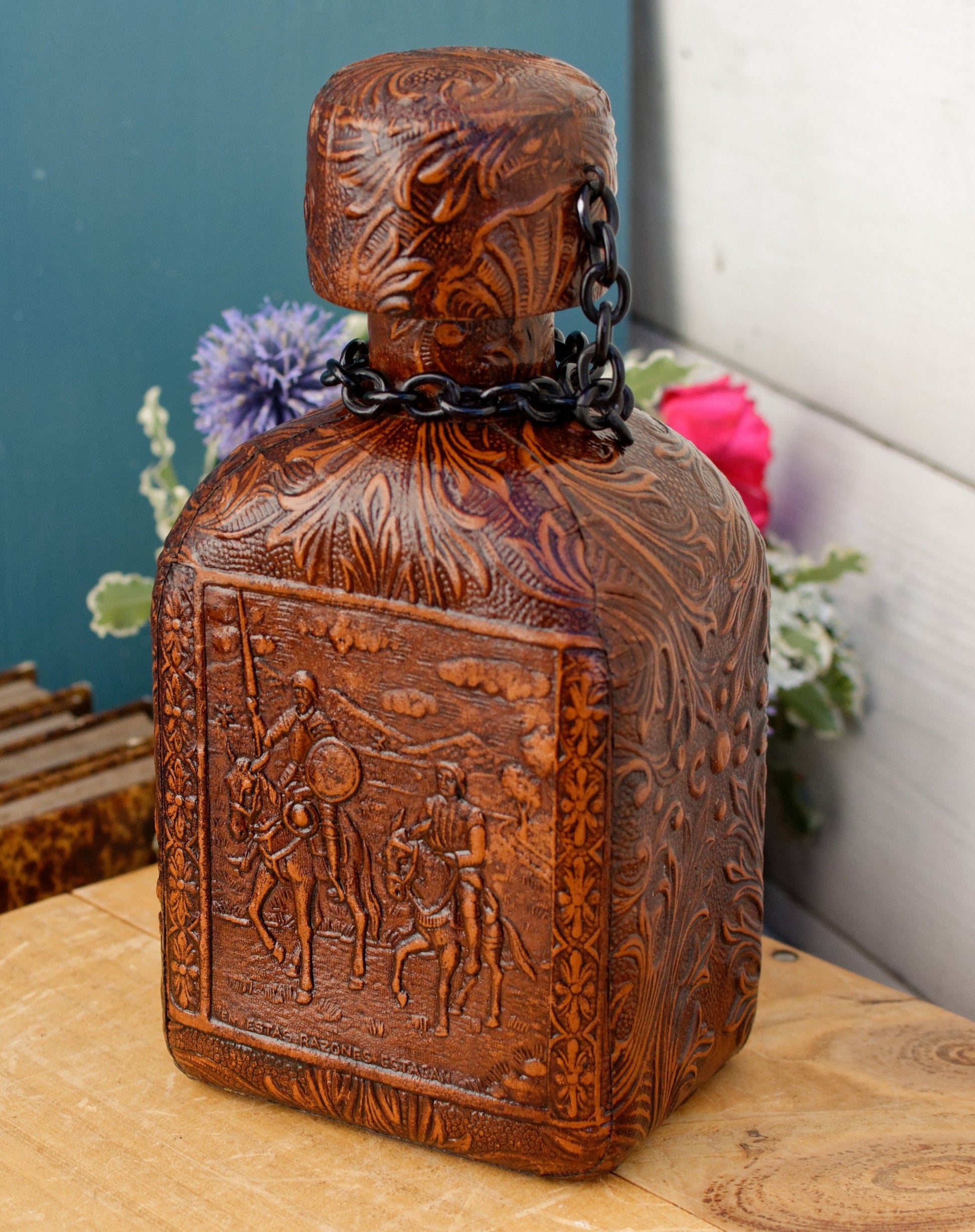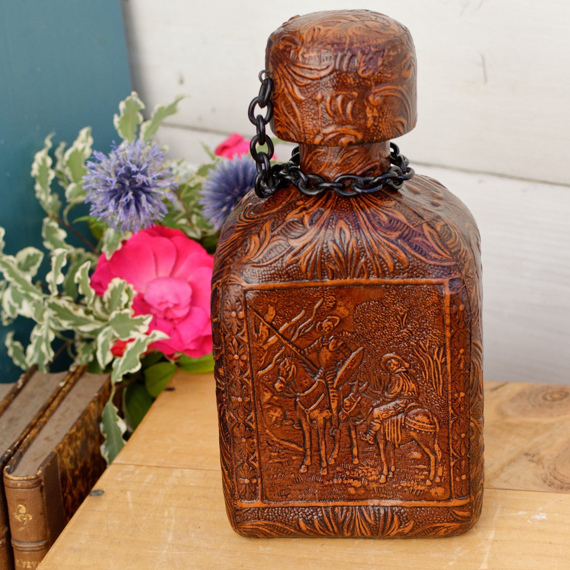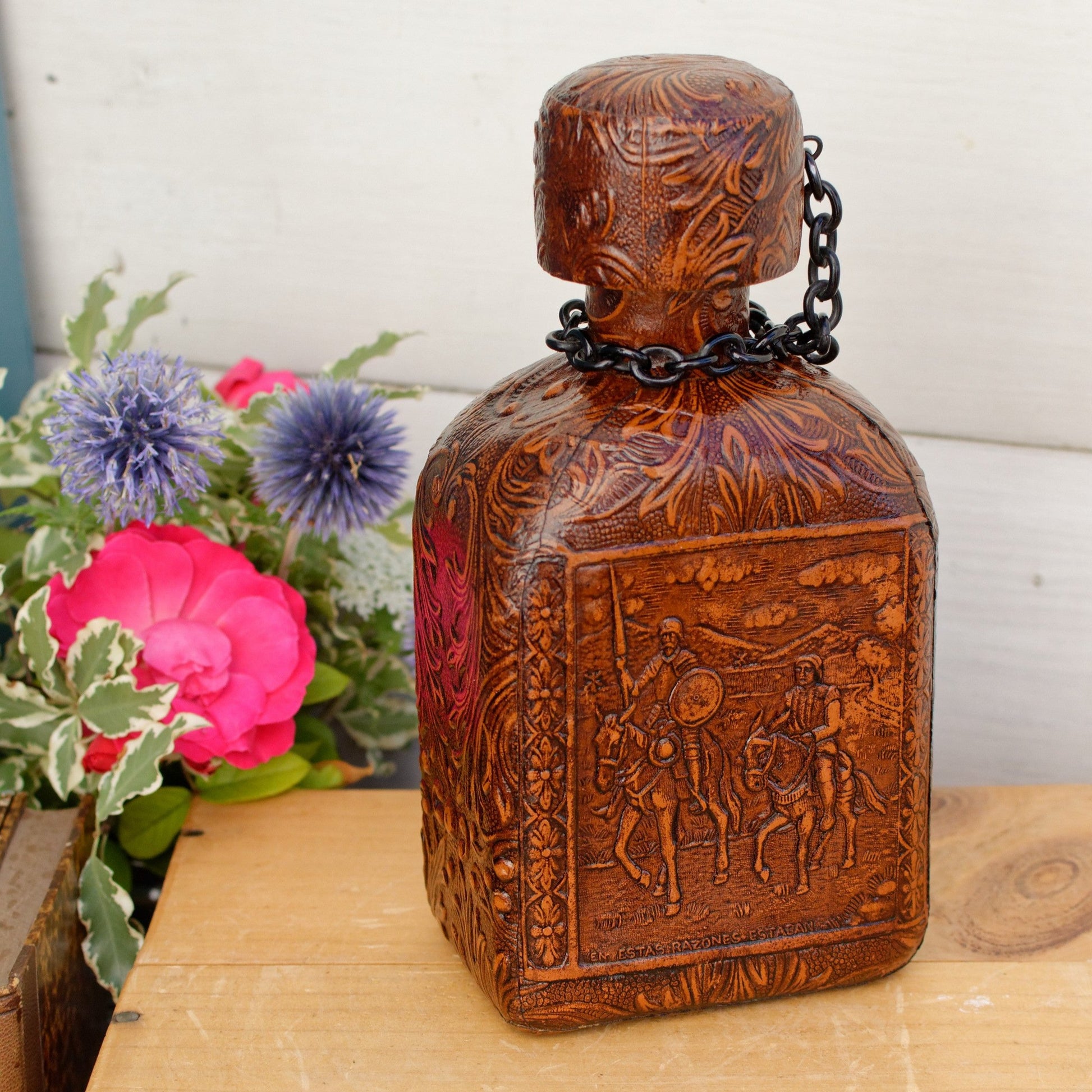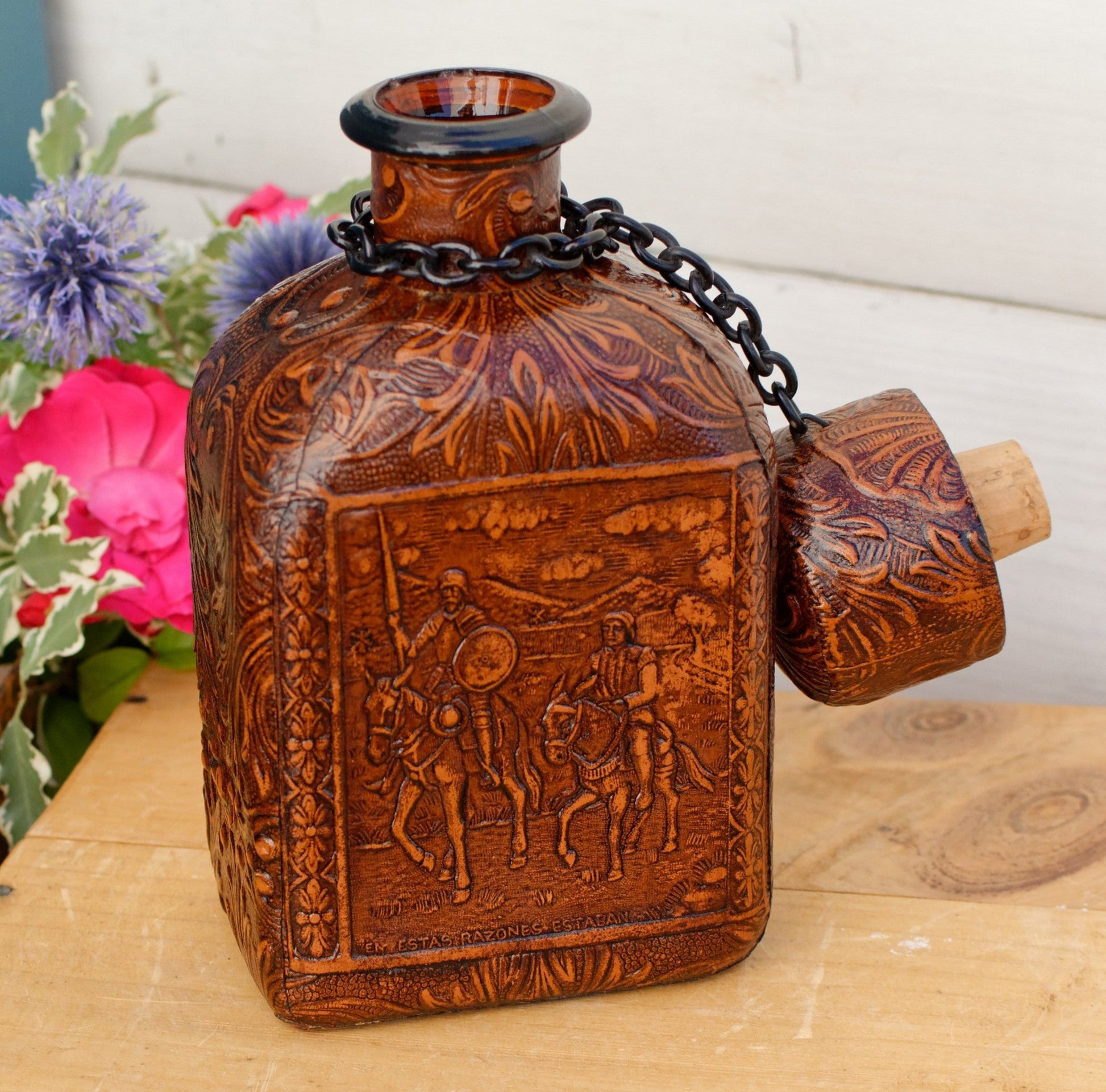 Lovely Rustic Vintage Covered Leather Liquor Bottle Decanter Barware with cork. Embossed Medieval Gother Viking style embossed design surface incribed in Spanish on the front "EN ESTAS RAZONES ESLABON" which means in these reasons link in English. It was used to store of old calvados "Vieux Calva" in the bottle cork.