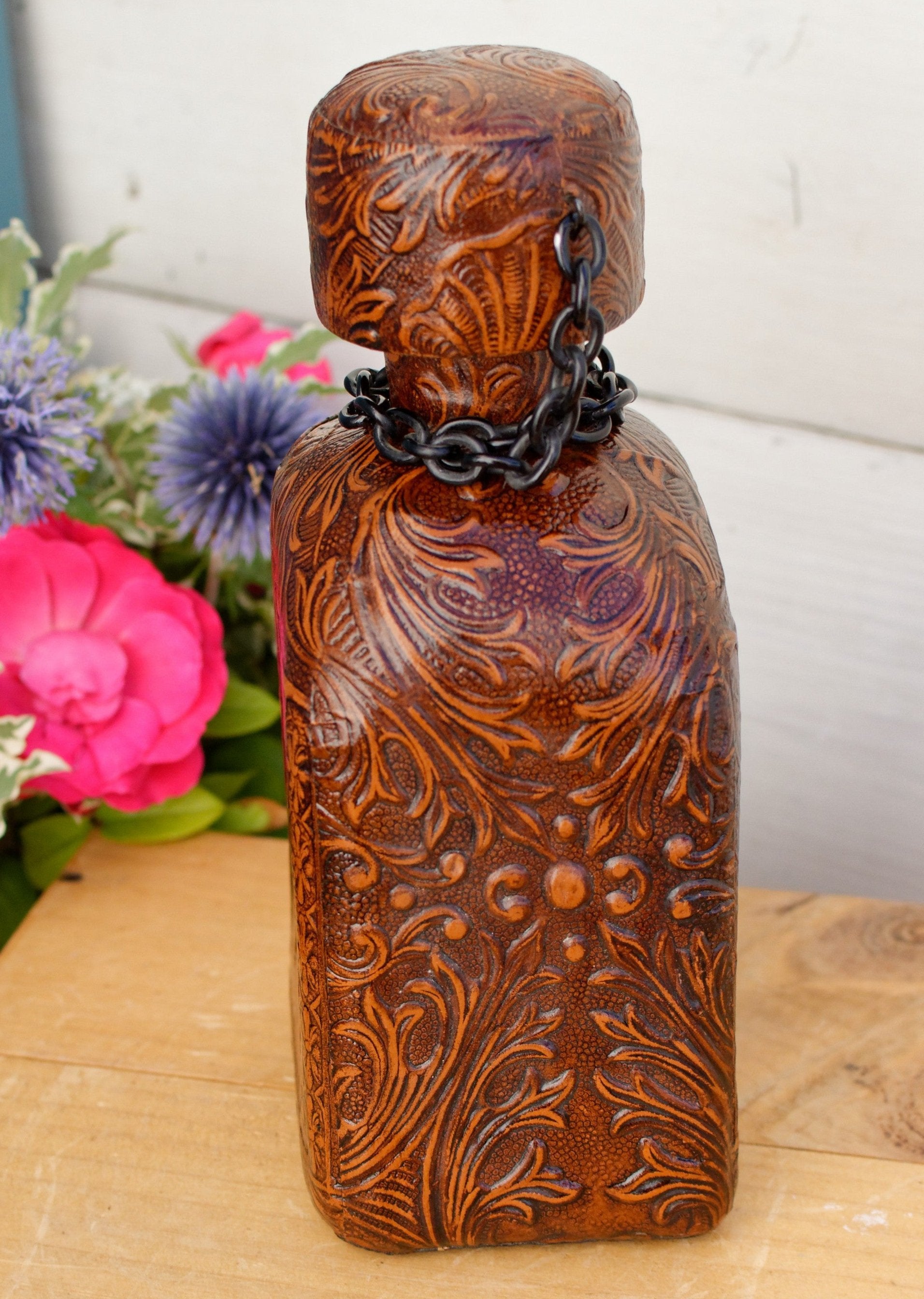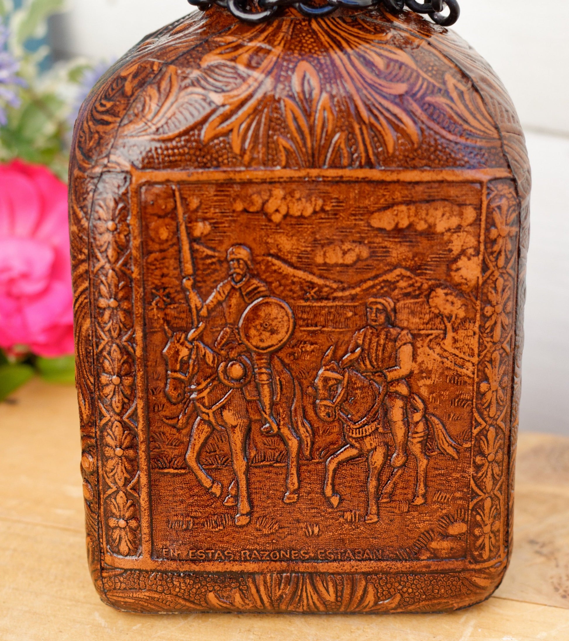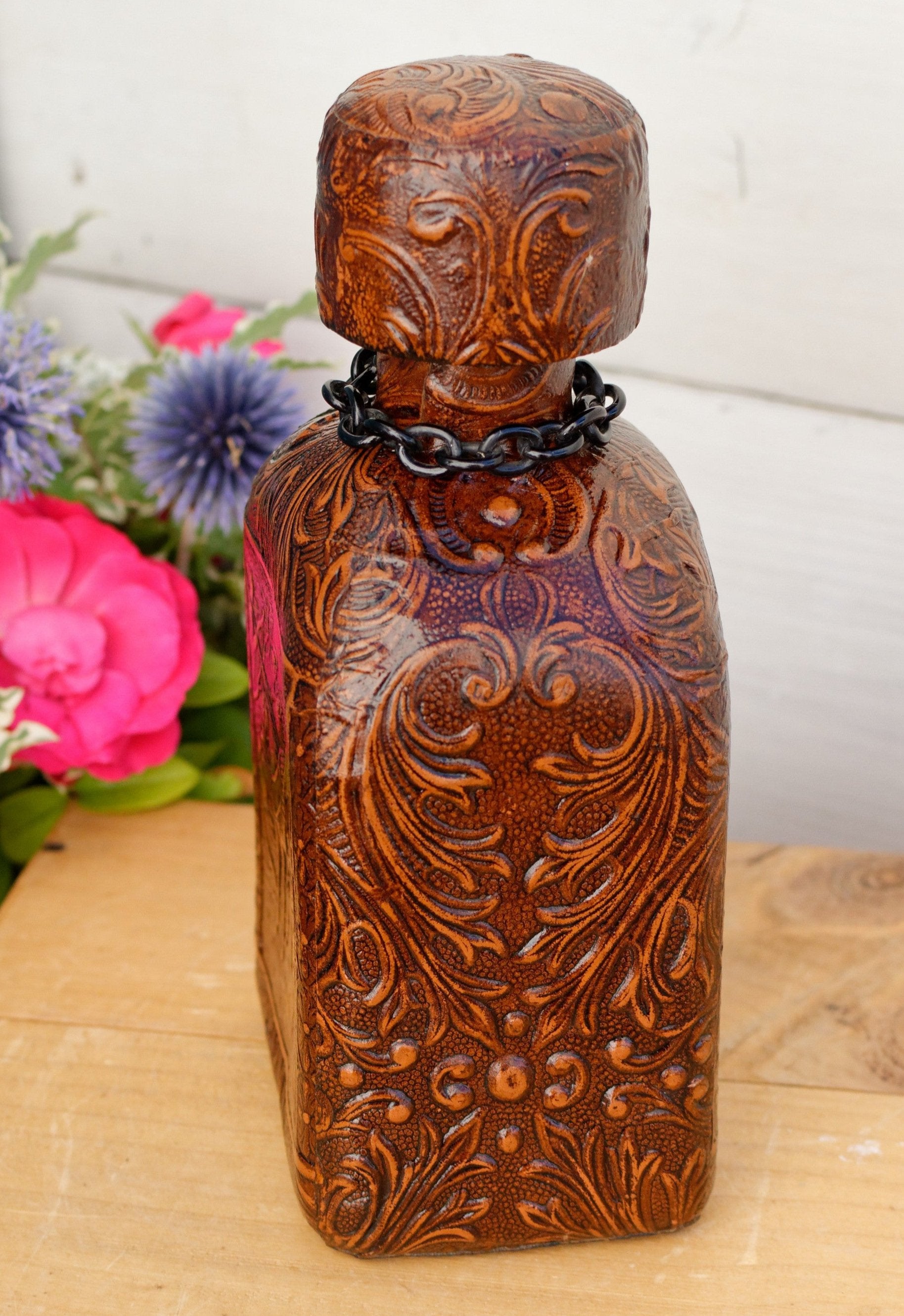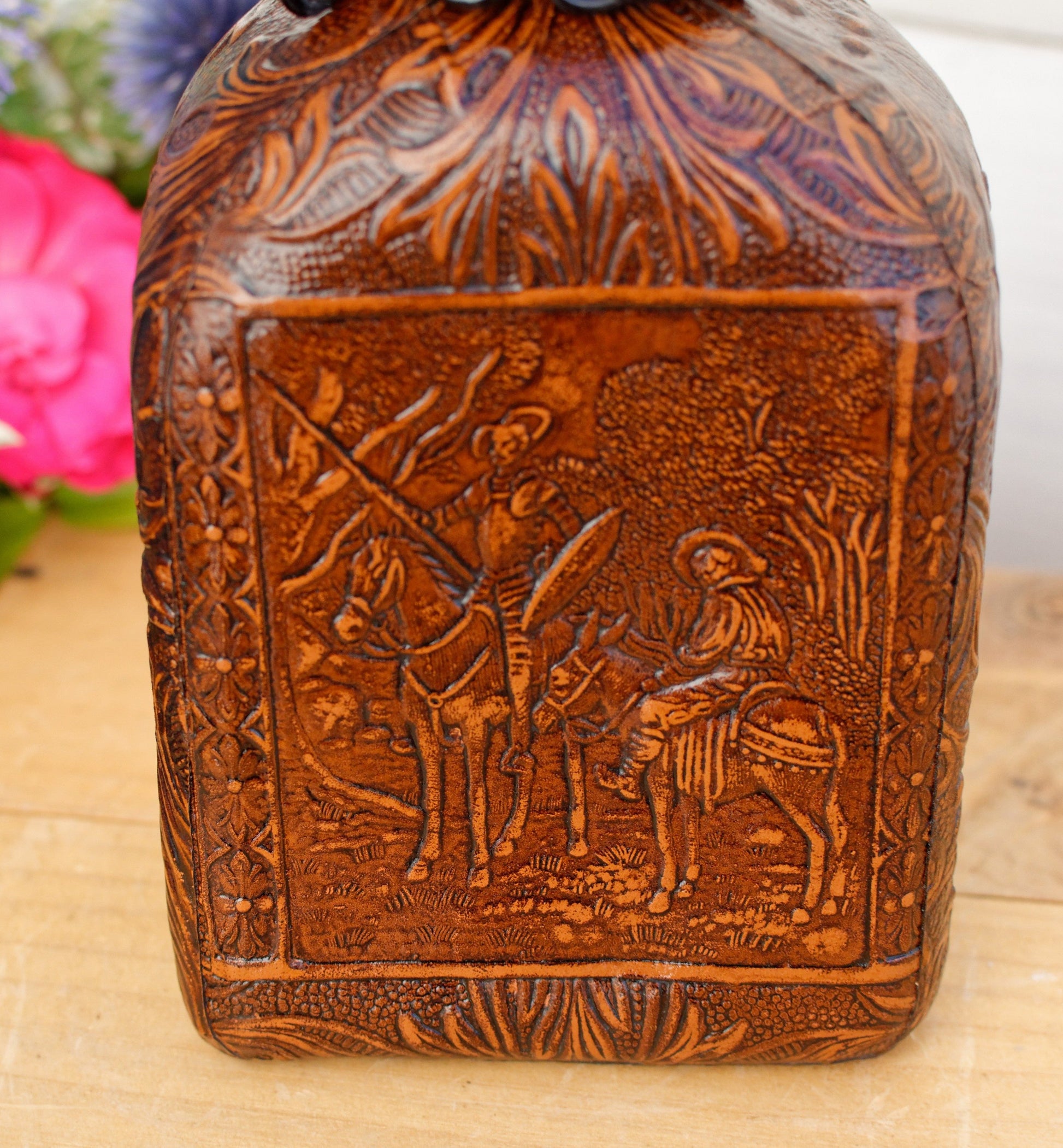 Lovely Rustic Vintage Covered Leather Liquor Bottle Decanter Barware with cork. Embossed Medieval Gother Viking style embossed design surface incribed in Spanish on the front "EN ESTAS RAZONES ESLABON" which means in these reasons link in English. It was used to store of old calvados "Vieux Calva" in the bottle cork.